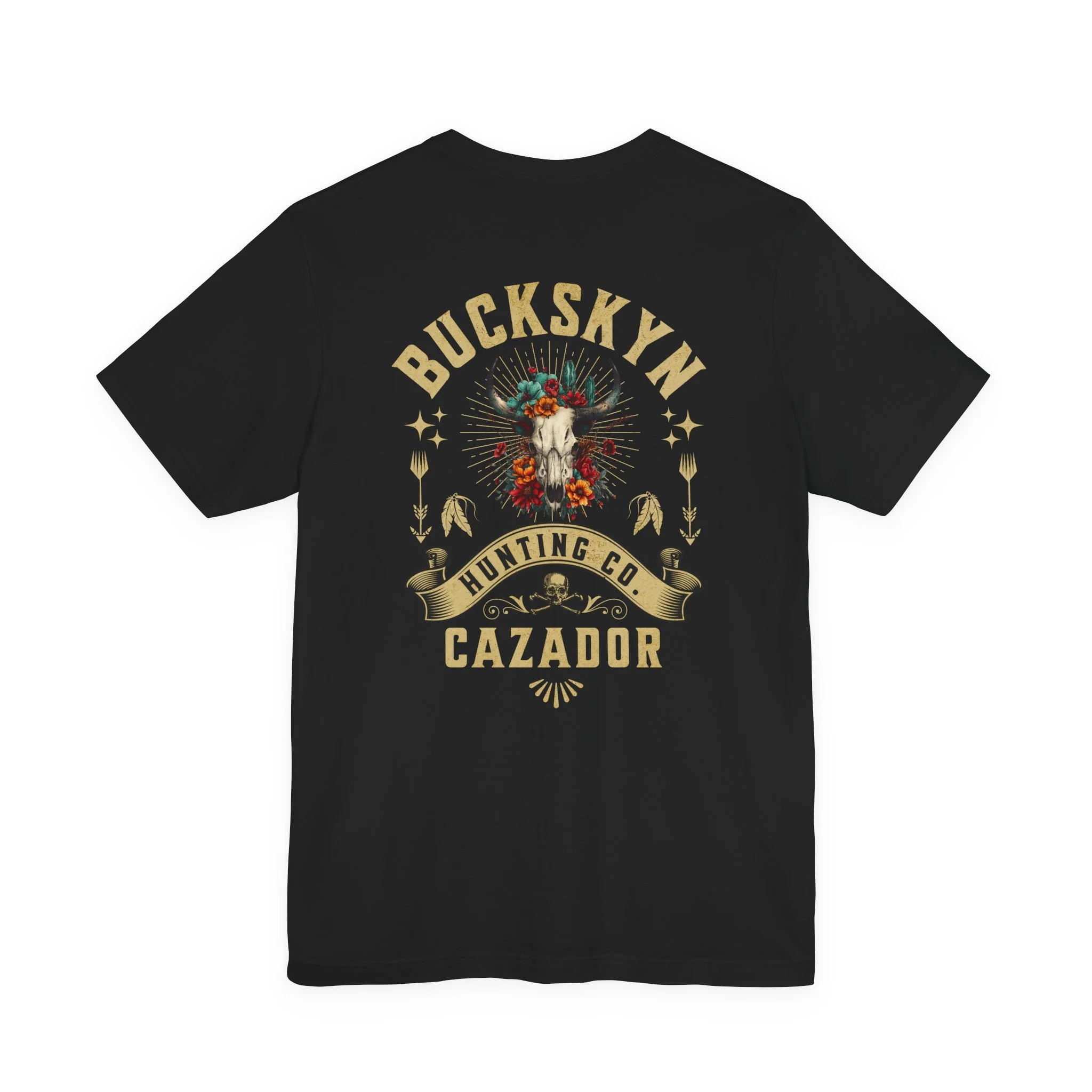 Cazador — the hunter — displayed across a soft, lightweight tee that moves with you. A lightweight, breathable jersey tee with vintage and Mexican-inspired artwork that feels like an old friend straight out of the favorite-tee drawer. The shirt layers easily and reads as both casual and considered. Wear it to a country concert, backyard bonfire, or on a dusty trail. Distressed western lettering paired with a skull-and-floral motif speaks to those who value heritage, tradition, and a touch of rugged Mexican influence.